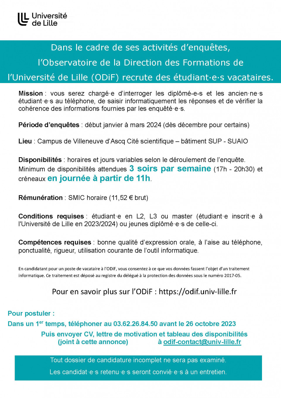 Dans le cadre de ses activités d’enquêtes, l’Observatoire de la Direction des Formations de l’Université de Lille (ODiF) recrute des étudiant·e·s vacataires