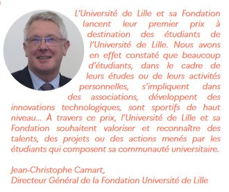 Avec ce prix "Inspirons demain", l’Université de Lille et sa Fondation valorisent et reconnaissent des talents, des projets et/ou des actions menés par ses étudiant·es. Que ce soit dans le cadre de leurs études ou de leurs activités personnelles, qu'il s'agisse d'un engagement associatif ou entrepreneurial, d'une innovation sociale, qu'ils ou elles soient sportif·ives de haut niveau, artistes...
