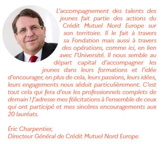 Chacun des lauréats est récompensé pour son projet par une dotation de 1 000€, financée par le Crédit Mutuel Nord Europe en sa qualité de mécène.