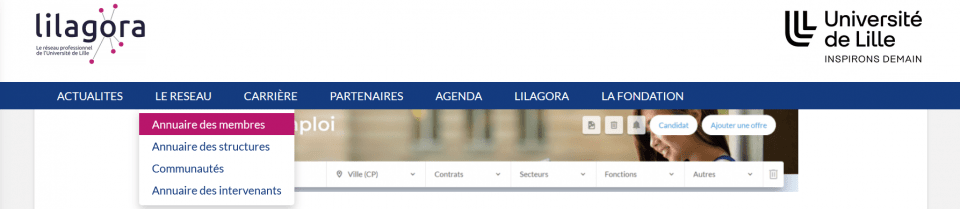 Pour accéder aux annuaires, cliquez sur Le Réseau, puis sur Annuaire des membres pour retrouver l’ensemble des utilisateurs inscrits sur Lilagora, ou sur Annuaire des structures pour cibler des entreprises.