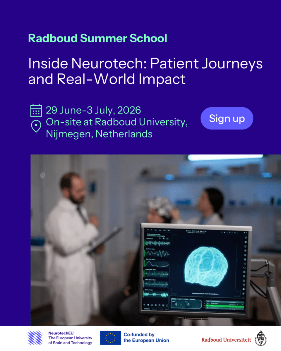 La Summer School “Inside Neurotech: Patient Journeys and Real-World Impact” se tiendra du 29 juin au 3 juillet 2026 à Nijmegen (Pays-Bas).