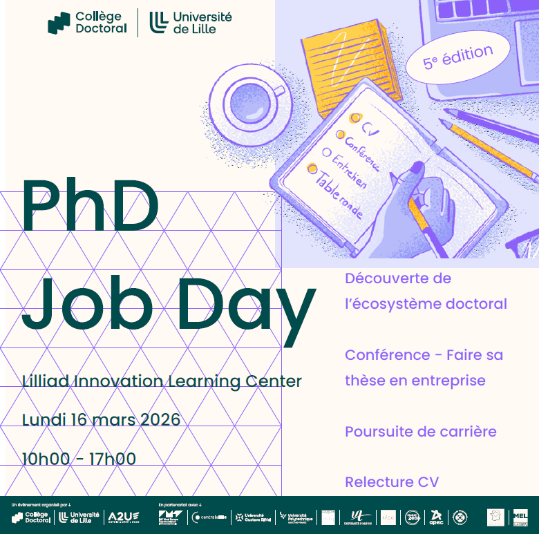 Le 16 mars 2026, retrouvez ensuite le PhD Job Day en présentiel à LILLIAD, Campus Cité Scientifique à Villeneuve-d’Ascq, de 10h à 17h.